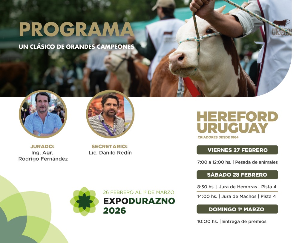 Del 26 de febrero al 1º de marzo de 2026, la Sociedad Criadores de Hereford Uruguay dirá presente en Expo Durazno 2026, uno de los encuentros más relevantes del calendario ganadero nacional. En este "clásico de grandes campeones”, Hereford Uruguay reunirá a cabañas, criadores y referentes del sector para vivir jornadas de evaluación, competencia y reconocimiento a lo mejor de la genética Hereford.